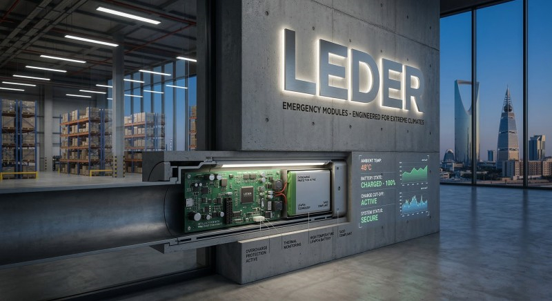 Specification Substandard "Cheap" Emergency Modules LEDER Lighting Export-Grade Modules Charge Topology Constant current / Continuous Trickle (No cutoff) Smart IC Controller with precise Voltage Cut-off Battery Chemistry Standard Li-ion / Low-grade Ni-MH High-Temp LiFePO4 or High-Temp Ni-Cd Thermal Runaway Risk HIGH (Severe swelling/leakage in heat) ZERO (Mechanically and electronically mitigated) Protections None or simple fuse Overcharge, Over-discharge, Short-circuit, No-load Target Market Suitability Fails under Middle East/Africa heat Engineered for high ambient temps (SASO/CE/CB compliant) Lifespan (at 45°C) < 8-12 Months (Premature failure) 3 to 5 Years (Stable capacity retention) Case Study: Defusing the Danger in a Riyadh Logistics Hub