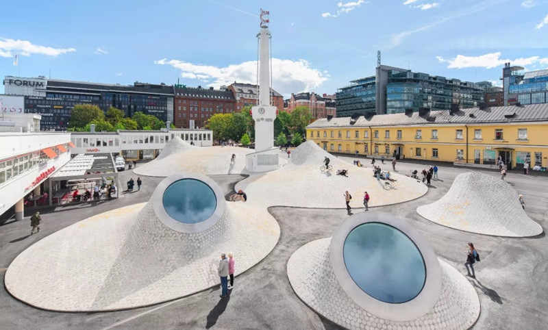 Lasipalatsi building is one of the best preserved functionalist buildings in Finland in the 1930s. It was built in 1936 in preparation for the Olympic Games.As the urban planning does not allow the building to extend above the ground, the museum and JKMM decided to extend the building under the courtyard which used to be a bus stop. The real focus of the whole renovation project is the public space as the roof. A series of structural domes, large and small, make the whole square look interesting. The inclined projection skylight brings natural light to the underground exhibition hall. On the ground, it is like a periscope, creating a unique shape of public space.