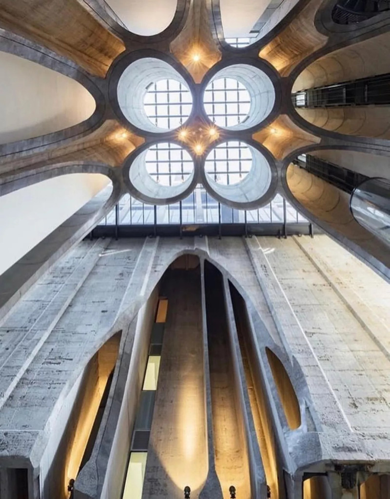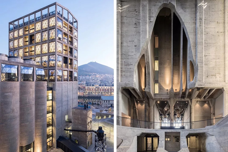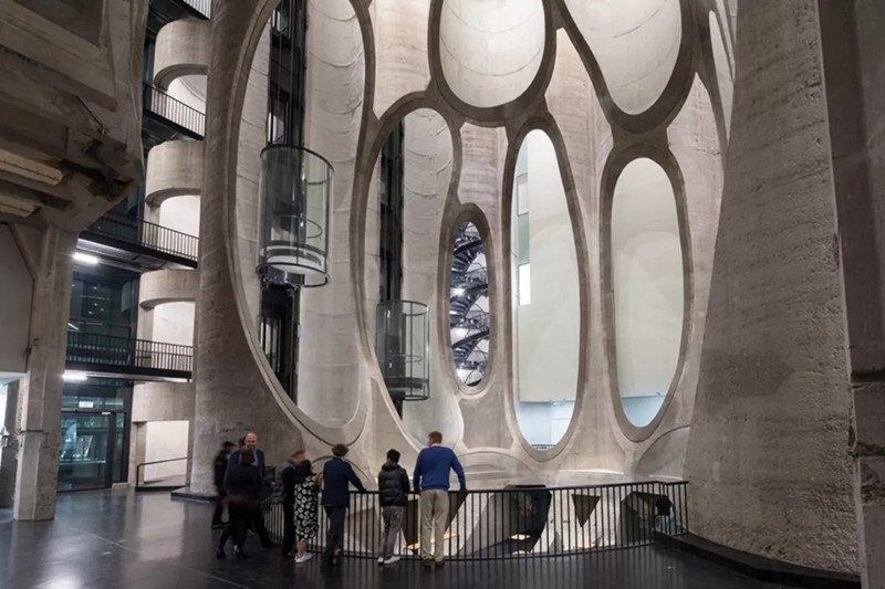 It was a barn in the 1920s, the tallest building in Cape Town. Heatherwick's team created a complex network of 80 gallery spaces by cutting huge pieces from the tubular structure of the building. In these places, the pipe is cut off and the edges polished to show the contrast between the coarse aggregate of the old concrete. Laminated glass is also used for mirror decoration, using a frit pattern designed by the late African artist El loko. The museum is surrounded by a huge grain shaped atrium, which is 27 meters high.