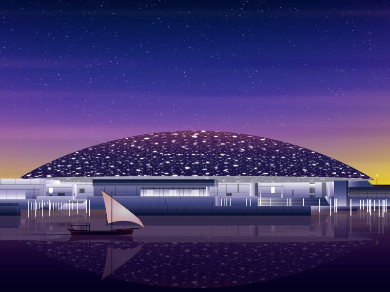 The Louvre in Abu Dhabi creates a quiet and intimate space full of light, shadow and reflection. A huge dome with a diameter of 180 meters covers the whole building. The dome contains four stainless steel outer layers and four aluminum inner layers, and its total weight is the same as that of the Eiffel Tower in Paris.