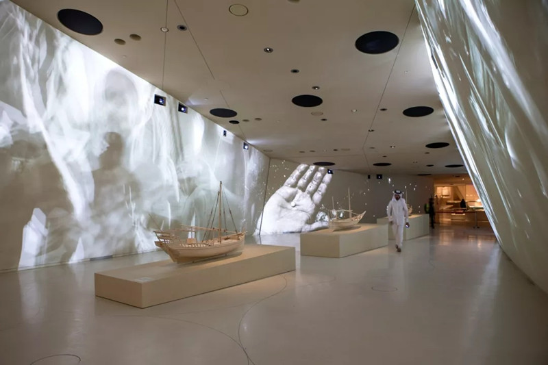From the exterior envelope to the interior wall and ceiling, these discs cut each other, creating an unusual Gallery inside. There are 11 in total, which are arranged as a loop line to take tourists to visit the history of the peninsula in chronological order, starting from geology and geomorphology, through the existence of early human beings, life in desert and coast, pearl industry and the modern history of the country. In the 324000 square feet of usable space of the museum, there are few vertical or horizontal planes. Even the floor slopes down in the middle and then rises to the final gallery. Spatially, it's a fascinating journey - every point of contact is unique, so you can't predict what you'll encounter next; Sometimes the space will shrink into a narrow canyon, and then rush into a spacious room to take you downstream.