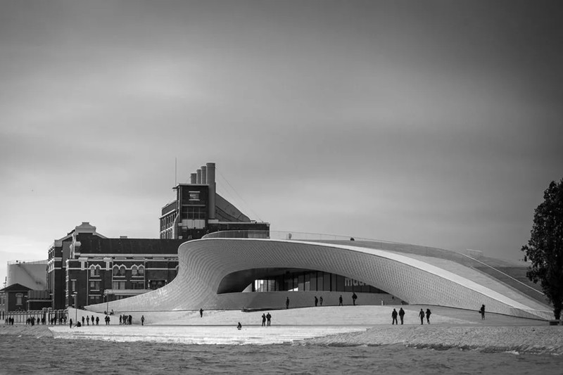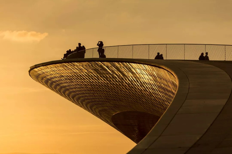 Facing the water, the view is wide. The building takes an exaggerated but very gentle posture. It is low, like a ripple rolled up by a river. The gentle undulation makes the roof of the building an outdoor space of the museum and a stage of the city. Here, visitors can enjoy the vision of the city and watch a movie set in Lisbon in the evening.