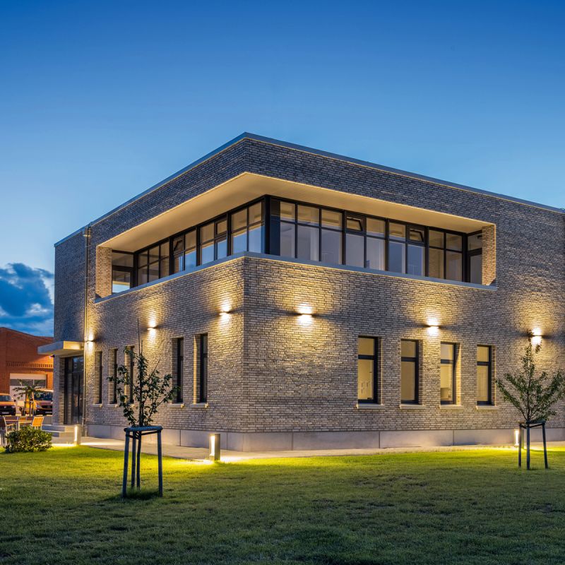 This office building radiates a warm, inviting glow created by Milliman Lighting wall luminaires and bollards.