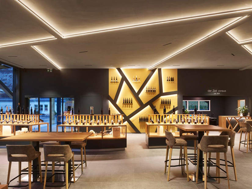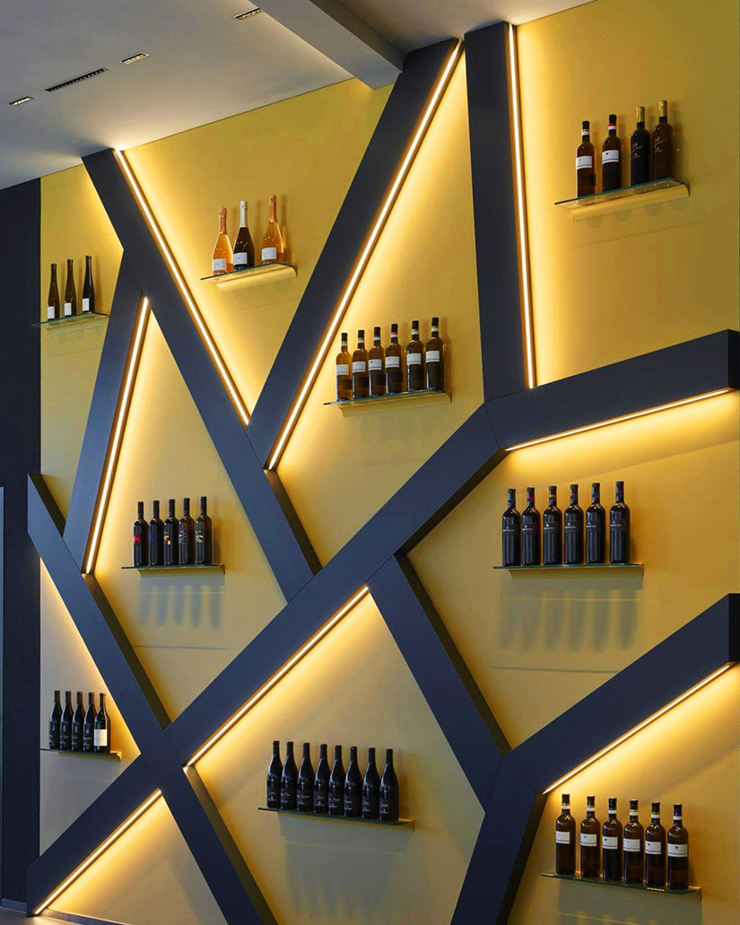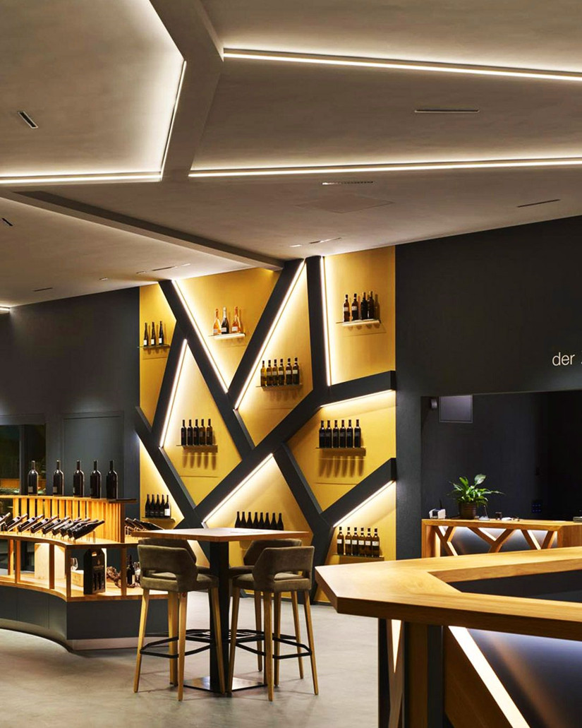 Underscore lines of light have been carefully installed in the wall and ceiling to create an interesting play of lights, while Laser Blade provides warm general lighting.