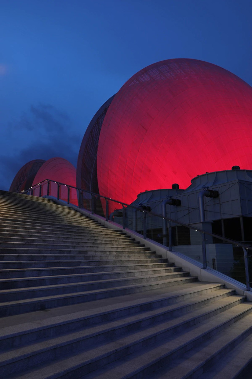 In order to solve the above challenges and achieve the most harmonious effect of the theater’s night scene, floodlighting is used to shape the building's shape on the facade of the building, and the building’s skin shape is highlighted by brightness setting and optimizing the projection angle. The interior façade uses glancing shots to enhance details and contour levels. Find the best lighting position, center on the middle of the shell, and gradually turn to glancing at the edge, and the brightness will gradually decrease, highlighting the fullness of the architectural form. The basic color temperature of 5000k makes the night view of the theater as bright and white as the moon; in order to meet the needs of the festival atmosphere of urban landmarks, RGB dyeing lamps and stage pattern light systems are added.