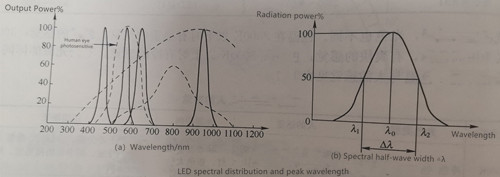 In general, LEDs emit optical radiation composed of multiple wavelengths of light, and the proportions of these wavelengths can vary. The spectral distribution of an LED is determined by the type and properties of the compound semiconductor used in its fabrication, as well as the PN structure (outer layer thickness, doping impurities), and is unrelated to the geometry and packaging method of the device. Figure 1-3 illustrates the spectral response curves of several LEDs fabricated using non-compound semiconductor doping.