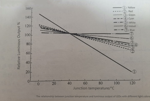 Like traditional light sources, LEDs generate electrical heat when they are in operation. Under the action of an external electric field, a large number of electrons and holes recombine in LEDs. Except for a small part of the energy released in the form of light energy, most of the other energy is released in the form of non-radiation, which causes the vibration of the semiconductor lattice and generates heat. Cause LED junction temperature rise. As the LED chip junction temperature rises, microscopic parameters such as electron and hole concentrations, forbidden bandwidth, and electron mobility inside the PN junction will change, thereby affecting the photoelectric parameters of the LED. For example, LEDs decrease lumen output as temperature increases, as shown in Figure 1-4. Another example is that the forward voltage drop of LED will decrease with the increase of junction temperature.