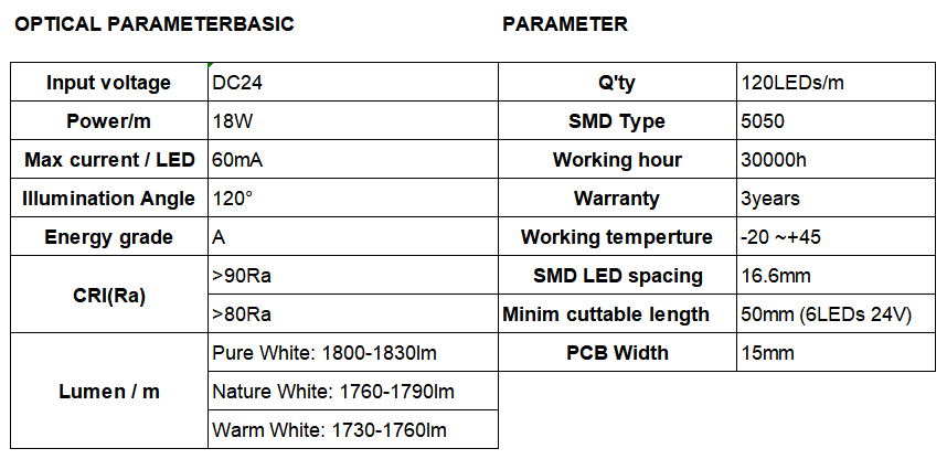 Optical parameter & Basic parameter for 5050 LED Strip Light Series