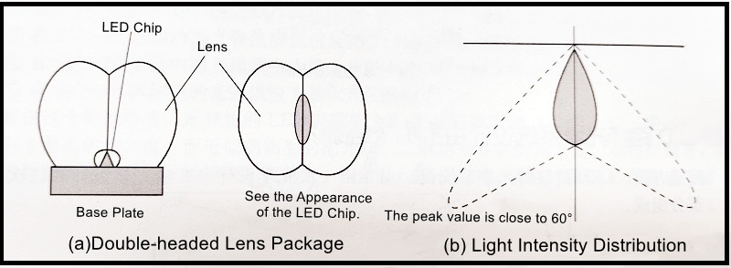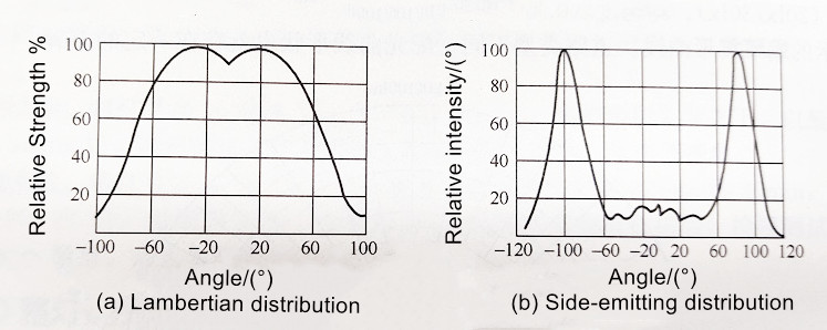 Figure 7-6(a) presents a schematic diagram of the primary light distribution of an LED packaged with a double-headed lens. Its light output characteristics are modified into a batwing shape, as shown in Figure 7-6(b), which can meet the requirements for road lighting. By redesigning the light distribution for LED street lights, we can achieve the desired road lighting effect.