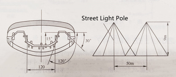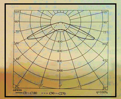 Typically, common expressway main road lights have light poles spaced at approximately 35 meters. To meet the requirements specified in the CJ]45-2006 standard, including average illumination (20Lx/30Lx), uniformity (0.4), and an environment ratio of 0.5, LED street lights must exhibit a strong output in the batwing curve shown in Figure 7-4. Different road types may have variations in the shape of their light distribution curves.
