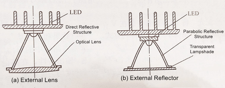 C. LED secondary light distribution with external lens and reflector. Figure 7-9 shows the LED secondary light distribution structure with external lenses and reflectors. As long as the LED is selected in a targeted manner, the appropriate lens is designed, and the curvature of the reflector is correctly selected, the light output of the LED secondary light distribution that meets the requirements can be obtained.