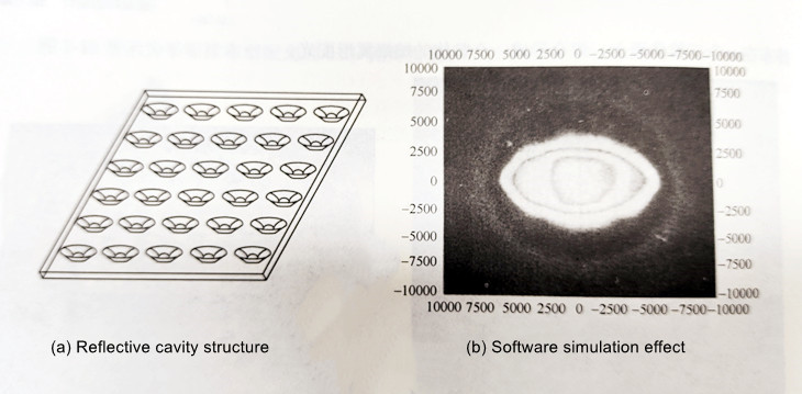In line with the principle of light reflection, the reflector is fashioned into a light-concentrating groove structure. Each groove corresponds to an LED light source (as seen in Figure 7-17(a)], enhancing light extraction efficiency and effectively controlling light emission angles and light intensity distribution. This, in turn, improves illumination uniformity and road surface brightness. Figure 7-17(b) presents a software-simulated effect.