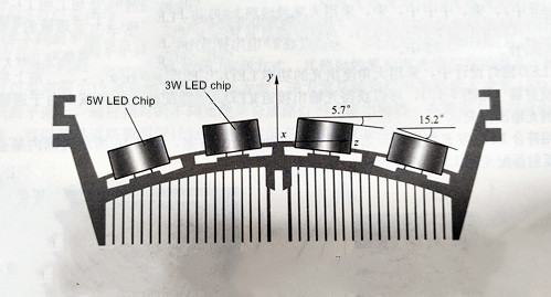 The schematic diagram of the light distribution structure for cylindrical lamps is depicted in Figure 7-11. LEDs with a narrow output angle, such as those using total reflection lenses with a range of ±30°, are installed and arranged in a cylindrical arc shape. This arrangement creates a light distribution of approximately 60° in the arc direction. Depending on the lamp's installation height, the elevation angle relative to the horizontal plane, and the distance between lamps, the curvature of the arc and the density of LED arrangement along the arc can be adjusted to achieve lighting effects on the road. This lighting pattern forms an approximate rectangular surface along the longitudinal direction of the road, meeting the relevant requirements of road lighting standards. However, this light distribution scheme does pose certain challenges, primarily in the integration between the heat dissipation plane of a single LED and the arc surface of the installation. This integration issue increases the complexity of manufacturing the LED street light's radiator and housing, and also results in a larger lamp body thickness.