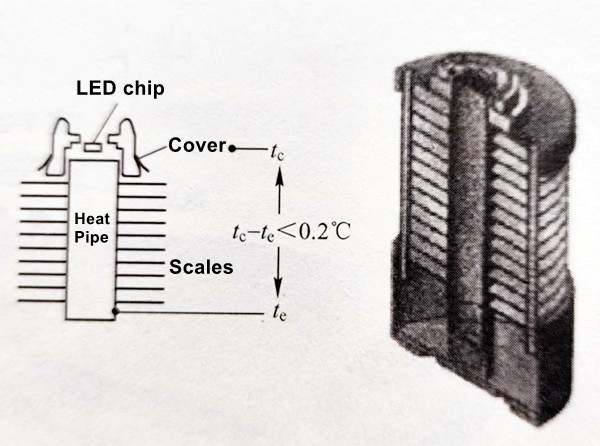 LED chips are typically directly mounted on top of the heat-absorbing section of the heat pipe, as shown in Figure 7-24. When the heat-absorbing section of the heat pipe is heated, the liquid in the capillary quickly evaporates, and the vapor flows to the other end of the heat pipe, where it releases heat at a slightly lower pressure. It then condenses back into a liquid, which returns to the evaporator section through the action of the porous material capillary. This cycle continues, continually conducting heat away. Adding many metal fins to the heat pipe can enhance convective heat dissipation to the surrounding air.
