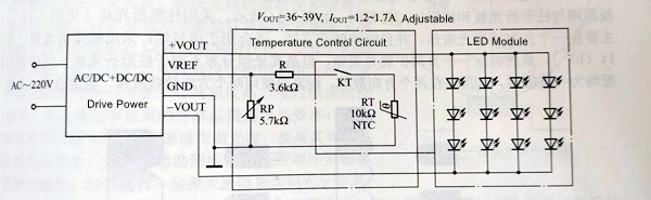 At room temperature, KT is in the open state, and RP controls the output current to be set at 1.6A. When the relay temperature reaches 56°C, KT automatically closes, and the temperature control circuit starts working to reduce the output current (IOUT<1.35A). When the relay temperature drops to 45°C, KT automatically opens, and the driver power supply circuit returns to normal operation, dissipating heat to the atmosphere through the LED module heatsink.