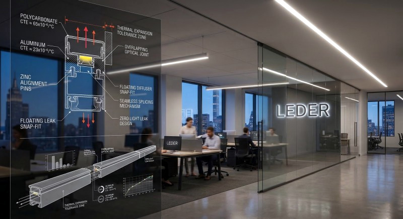 The Engineering Solution: Advanced linear lighting systems utilize specialized extruded aluminum profile designs with floating PC cover tolerances, overlapping optical joints, and precise snap-fit geometries to absorb thermal movement.