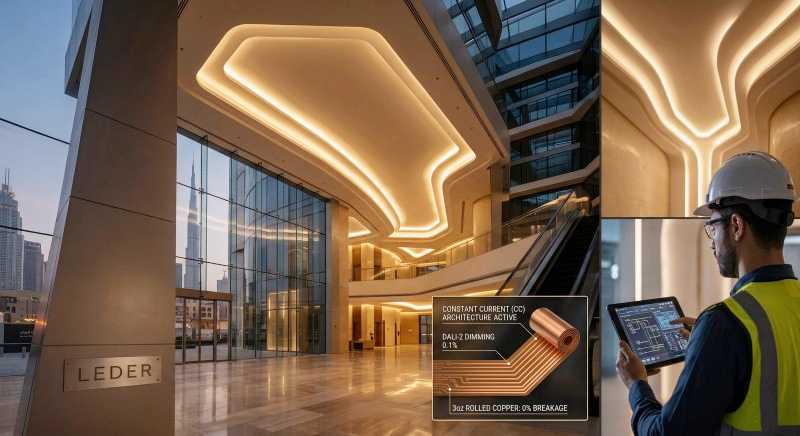 Actions: The lead architectural firm abandoned standard CV strips due to the high risk of voltage drop and the sheer impossibility of routing hundreds of power supplies into the ceiling. They consulted with LEDER Illumination to specify our Premium CC 24V LED Strip with a 4oz rolled copper FPC and advanced DALI-2 dimming protocols.