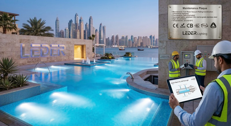 The LEDER Advantage: LEDER Lighting provides highly cost-efficient, mass-produced, and CE/CB/SASO-certified underwater lighting solutions designed for high-heat and high-salinity environments in the Middle East and Europe.