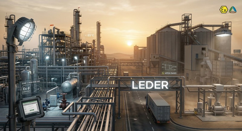 Actions: The local procurement team partnered with LEDER Lighting for a high-volume upgrade. LEDER supplied 1,200 units of Ex d LED floodlights (150W, 140 lm/W) for the petrochemical Zone 1 area, and 800 units of Ex t dust-proof high bays (100W, IP66) for the grain silos. All products featured SASO certification and custom heat-sinks rated for 60°C ambient temperatures.