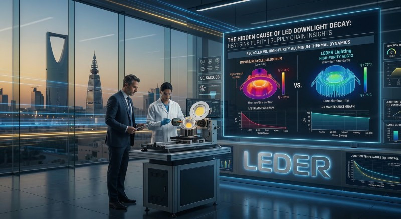 Meta Description: Discover why cheap recycled die-cast aluminum heat sinks destroy COB chips in LED downlights. LEDER Lighting offers CE/SASO certified, high-purity aluminum solutions for bulk procurement in Europe & the Middle East.