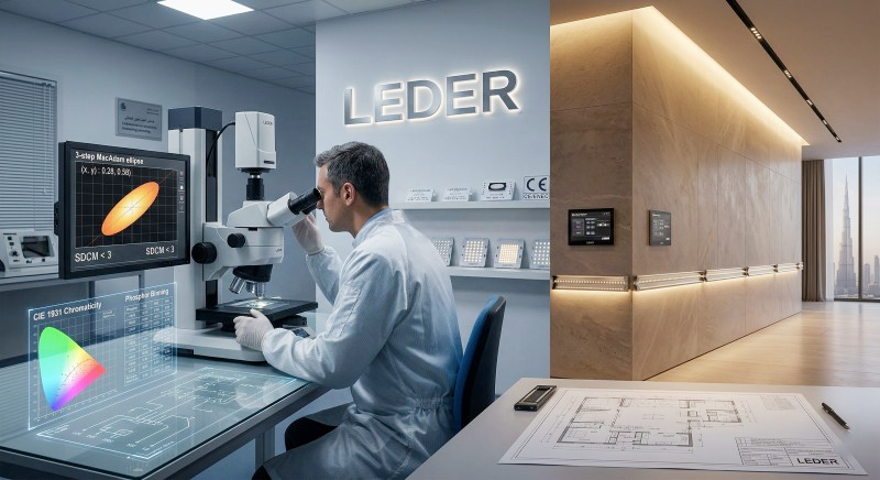 Meta Description: Discover how LEDER Illumination utilizes strict 3-step MacAdam ellipse binning to eliminate LED color variation in high-end architectural projects across Europe and the Middle East. Ensure CE/SASO compliance and flawless visual comfort.