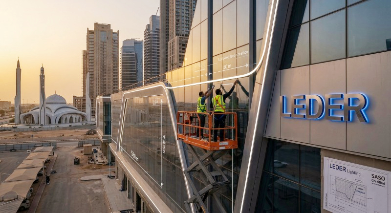 Context: A large-scale commercial complex in Riyadh, Saudi Arabia, required 3,000 meters of continuous contour lighting for its exterior facade and rooftop parapets. The initial bid specified standard 24V IP65 LED strips.Actions: The lead contractor partnered with LEDER Lighting to redesign the procurement strategy, switching to LEDER’s 230V Wire-Free Constant Current LED Strips, shipped directly from our high-capacity manufacturing base with full SASO compliance.Results/Metrics: The elimination of 300+ exterior-rated LED drivers, protective junction boxes, and kilometers of heavy-gauge copper wire saved the project over $28,000 in auxiliary materials alone. Scissor lift rental days were reduced by 45%.Lessons: For architectural-scale linear lighting, calculating the Total Cost of Installation (TCI) proves that investing in no-voltage-drop, continuous-run technology yields exponentially higher ROI than sourcing cheap low-voltage strips.